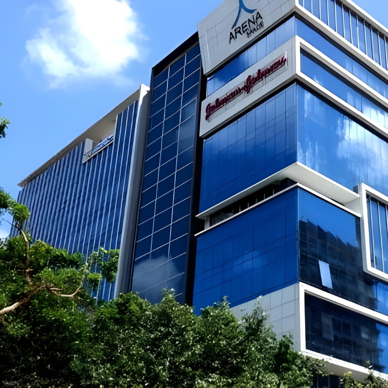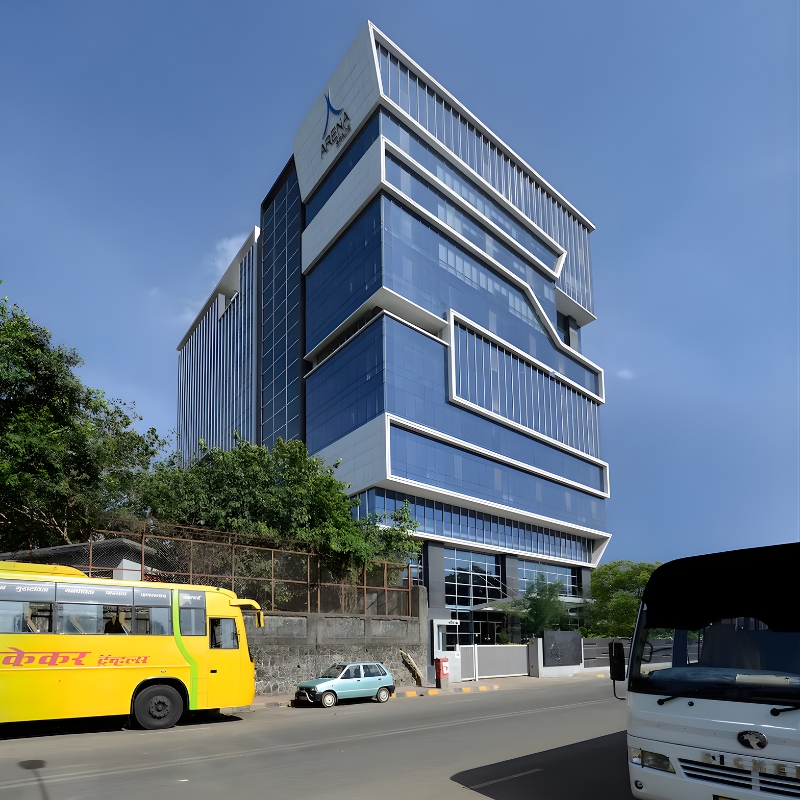 Arena Space is a commercial office building designed and developed by Architects & Interior Designers, GA Design. The building is designed to be oriented north, overlooking the lake and visible from the JVLR Road, Mumbai. Each floor is a single rectangular office with the services located on the Southern side. The remaining three sides have strategic views and therefore have a complete glass facade that ensures uninterrupted vision.